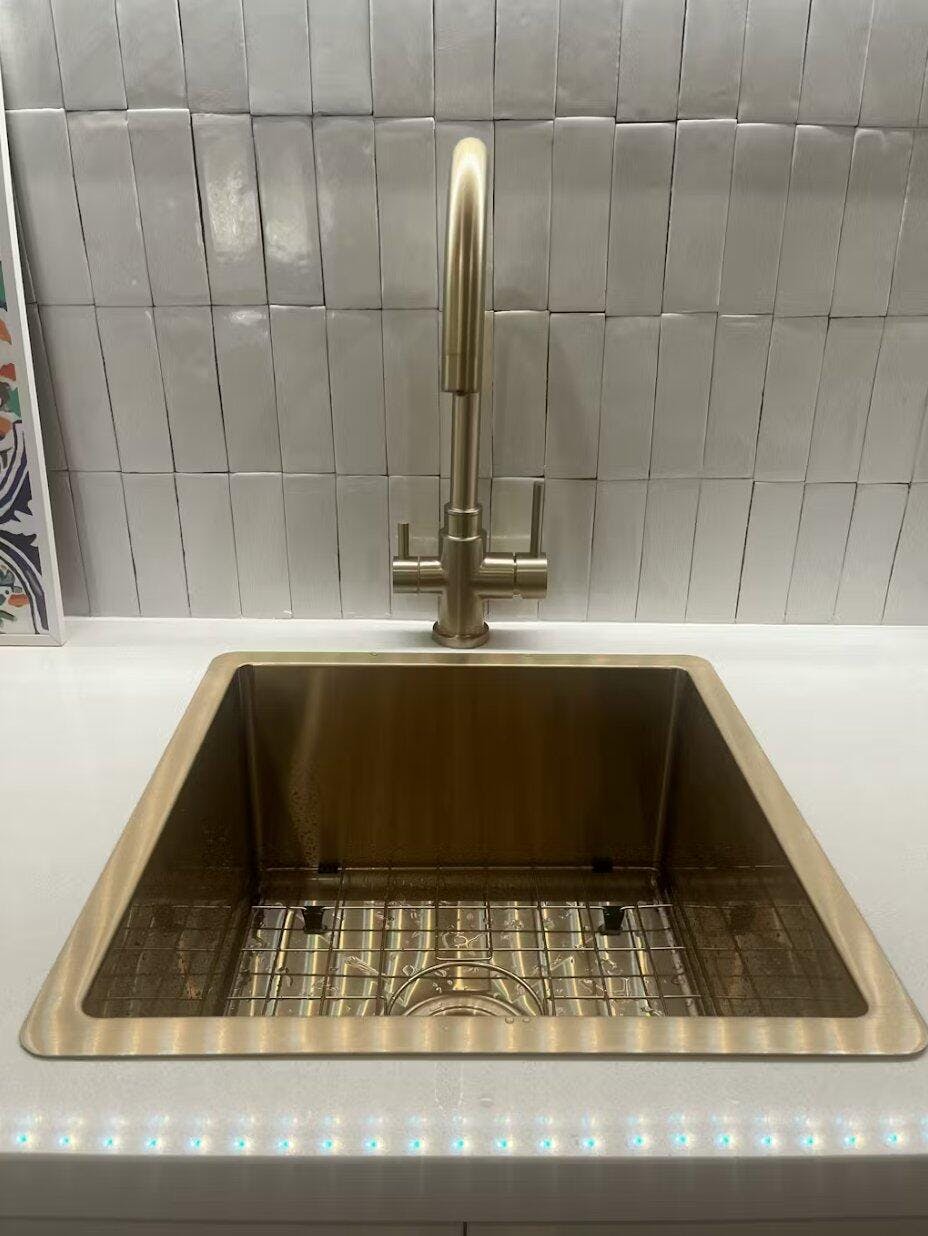 This mixer replaces both your standard kitchen tap and your mini filter tap — offering filtered drinking water, hot water and cold water through a single beautifully designed outlet. The brushed gold finish is crafted using PVD coating for lasting durability and is a popular match with brushed stainless steel sinks, such as the Buildmat sink range.
