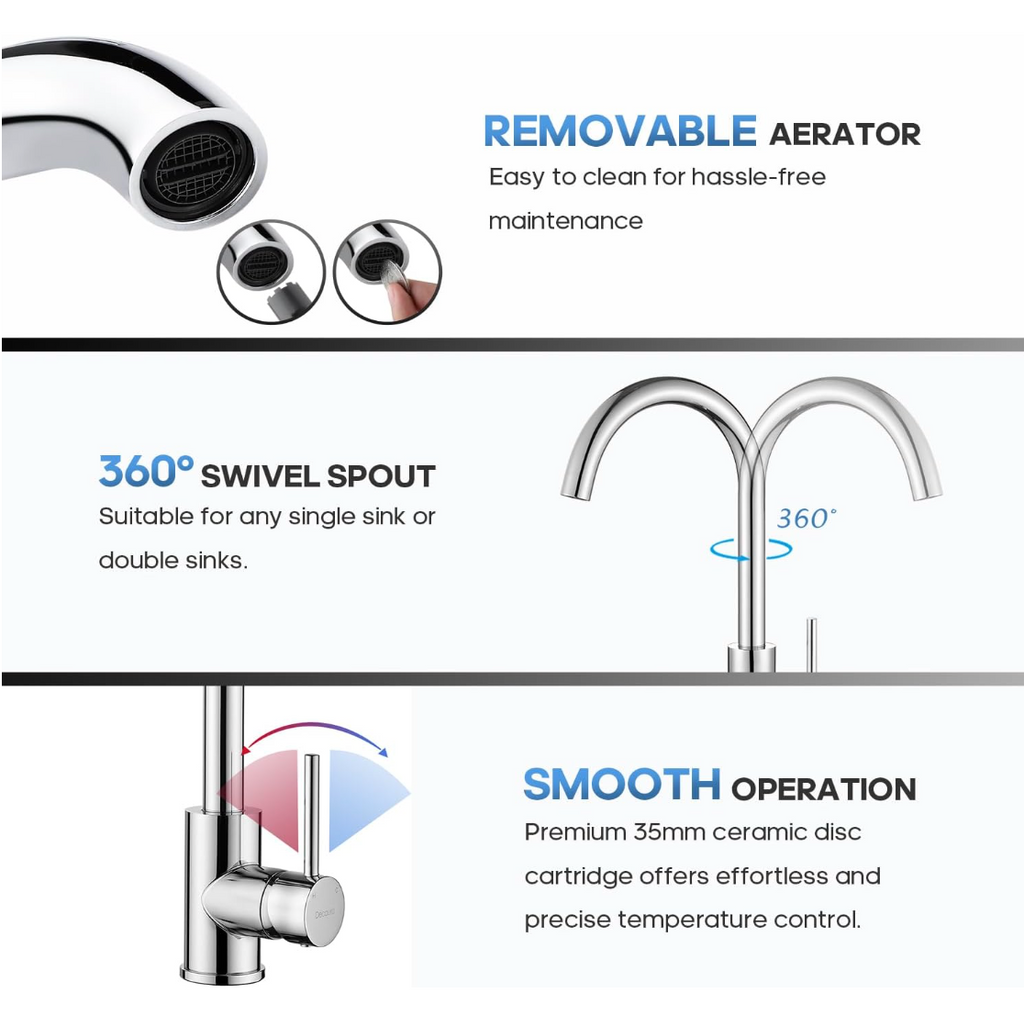 The rotating swivel spout provides convenient water direction control, making rinsing and washing easier. The single-lever handle provides smooth and precise adjustment of water temperature and flow, supported by a European 35mm ceramic cartridge known for its long-term durability and drip-free operation.